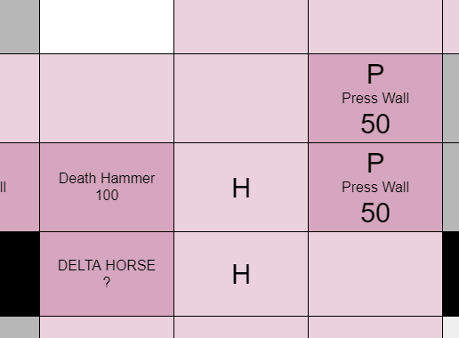 Valor moves from C2 to D2. Valor steps on Bear Trap! Ambled by Bear Trap, Valor loses 1 HP moving to E2. On the way Valor is struck by DELTA HORSE from D3... ... ... ... Loading... Loading... Loading. . . 18 damage. 2 enemy traps are erased from time. Ambled by Bear Trap, Valor loses 7 HP while moving to H6 without incident. At H6, Valor puts out Torch of Souls! Screams of DAMNED are heard. Could it be...? At H6, Valor is struck by falling block from Press Wall located at G7! 5 damage! Ambled by Bear Trap, Valor loses 4 HP while moving to E7 without incident. At E7, Valor is struck by falling block from Press Wall located at D8! 5 damage! At E7, Valor is massacred by Death Hammer from E8! 10 damage! OR It would be, if DELTA HORSE did not cause Death Hammer to become erased from time. . . . There is no damage from E8. Ambled By Bear Trap, Valor loses 1 HP while moving to E8. On the way Valor is struck by DELTA HORSE from D3... ... ... ... Loading... Loading... Loading. . . 6 damage. 1 enemy traps are erased from time. Ambled by Bear Trap, Valor loses 4 HP while moving to E12 without incident. Valor collapses from wound (blood loss) and expires at D12, with Portal to Twisted Demonic Realm just in sight...!