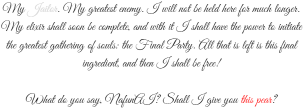 [reading the note just kind of like. his first instinct is to destroy the pears, but that didn't work out so well last time, so he's going to leave it alone for the moment.]