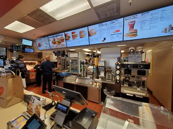 The WcDonald's kitchen has a state of the art WcDonald Rotational Deep Fryer, an Ice Cream Machine, and a Burger Assembly Counter. Also, from here you can comfortably view and interact with the service counter and its cash registers, behind which employees safely take orders from those in the Dining Room from miscreants demanding their WcFlurries be given to them for free and that their manager be summoned from the depths this instant.